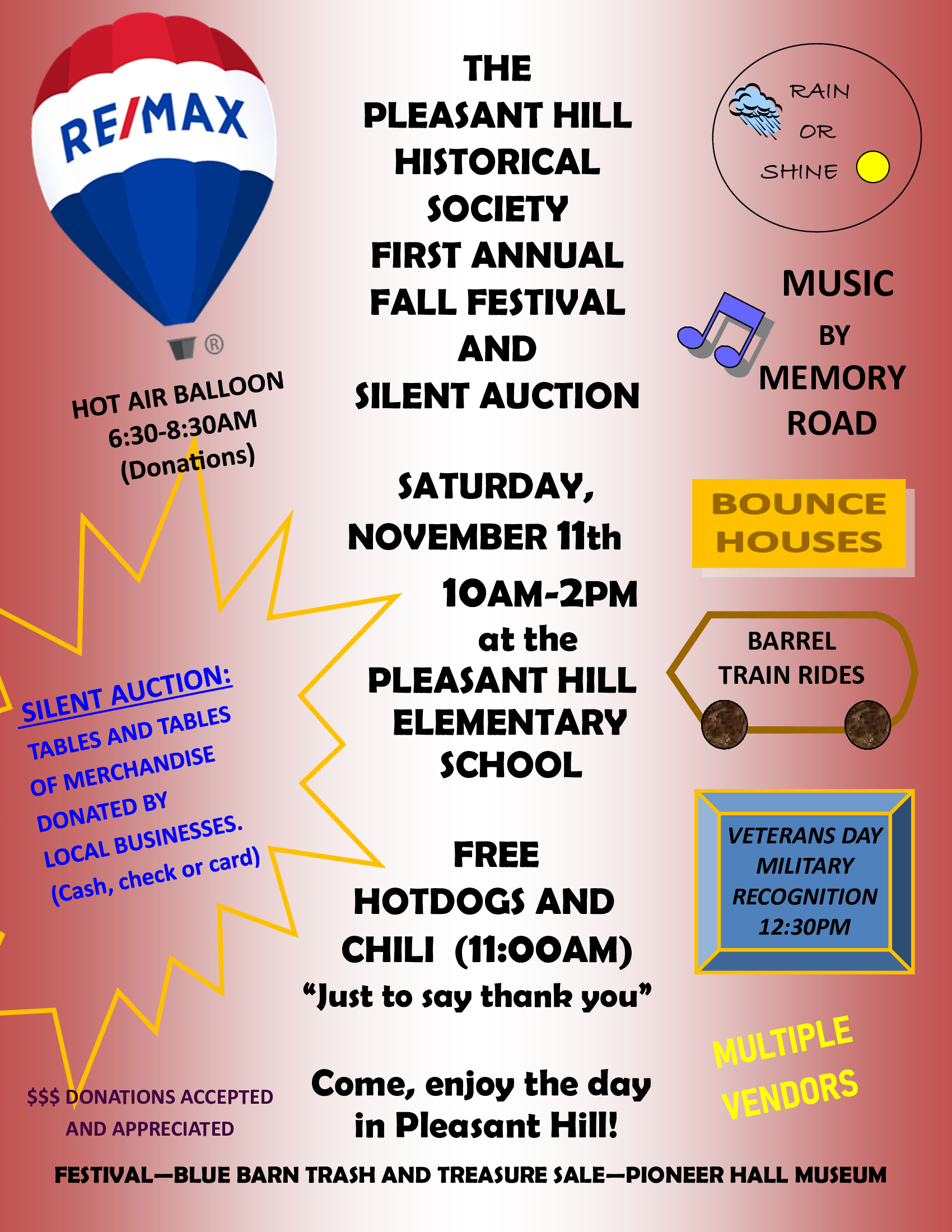 A different than usual Memory Road Duo combination (Dennis & Glen) will be providing entertainment for the Pleasant Hill Historical Society 1st Annual Fall Festival and Silent Auction on Saturday, November 11, 2023. This is a fund raising event for the society, to be held at the Pleasant Hill Elementary School (see map below for directions).